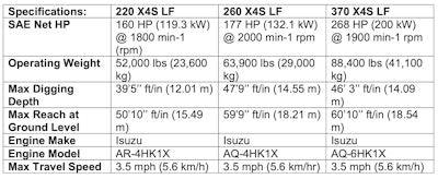 The Link-Belt chart below gives a spec comparison of its new 220, 260 and 370 X4S Long Front Excavators.