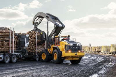 Volvo says its new L200 High Lift can stack logs to heights of 23 feet.Volvo CE
