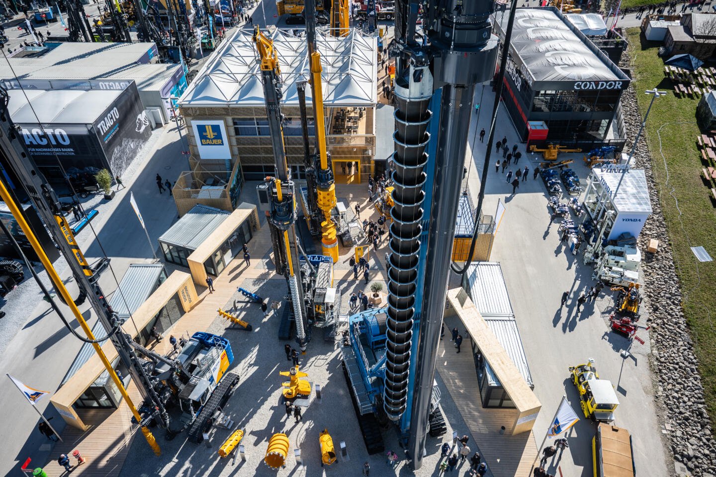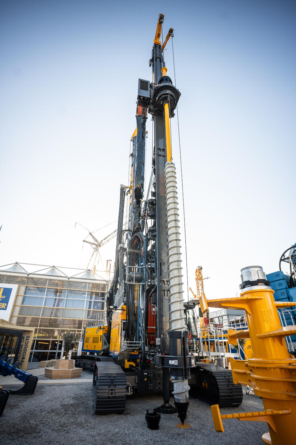 The largest exhibit at the Bauer stand was the BG 55. With its V-kinematics – a mast that can be shifted forward in transport position – it combines a high level of rigidity for demanding applications with exceptional versability during mobilization. Its mobilization package, including remote control and hydraulically activated main connecting bolts on mast and kinematics, enables fast and safe commissioning. At bauma, the BG 55 was displayed with an equipment package for the CCFA (Cased Continuous Flight Auger) double-head drilling method. Thanks to the enhanced Bauer Torque Multiplier (BTM 600) with increased torque (600 kNm) and an optimized transmission ratio for higher speed on the inner auger, both the auger and the casing are newly coordinated and powered simultaneously. This enables deeper and larger CCFA boreholes.