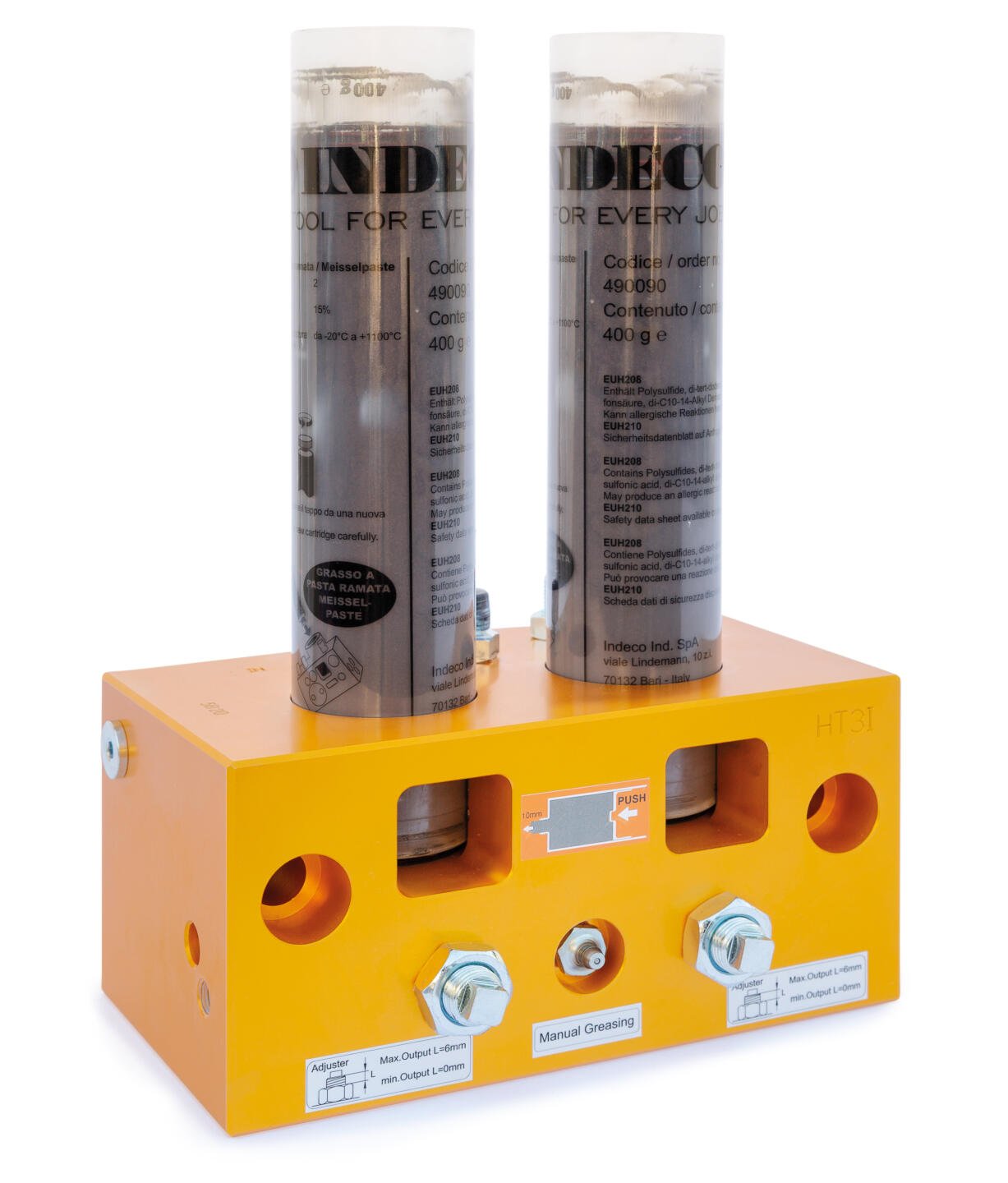Among the accessories for hydraulic hammers, the automatic greasing system is designed to keep the hammers in perfect working order at all times by using the right amount of lubricant and cutting out the machine downtimes needed for manual greasing. Following the specific request of users, Indeco technicians have recently started using smaller hammers. The systems are divided into two categories: those with a control unit and a tank mounted on the excavator, and those on-board mounted directly on the hammer fitted with a pump and cartridge. Only the “Compact” and “Maxi” versions of the on-board systems were upgraded, which now no longer feature two HYD lines but a single HYD line as on the “Small” model.