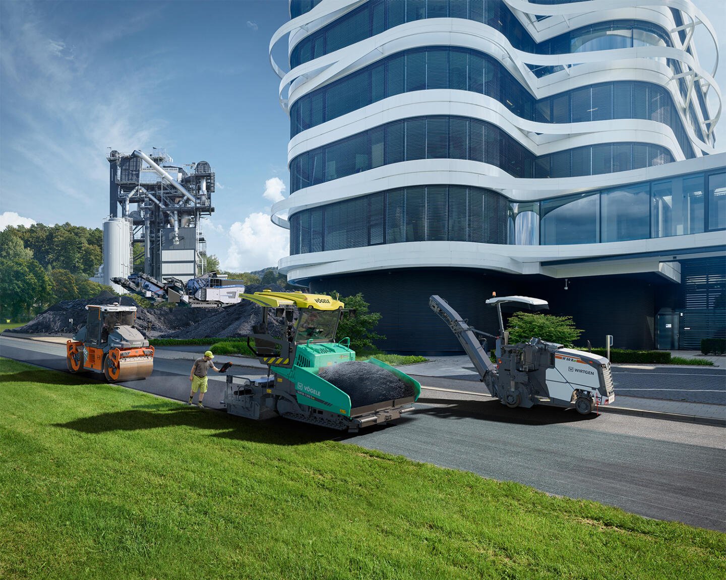 This includes a cold milling machine, a road paver, a tandem roller, an asphalt mixing plant, a crushing plant, and a whole suite of specially tailored digital solutions. The outcome of all this is a reduction of CO2 and noise emissions and lower operating and energy costs. This in turn enables a more sustainable and simultaneously more profitable project realization.